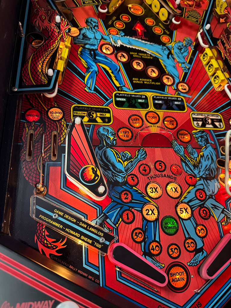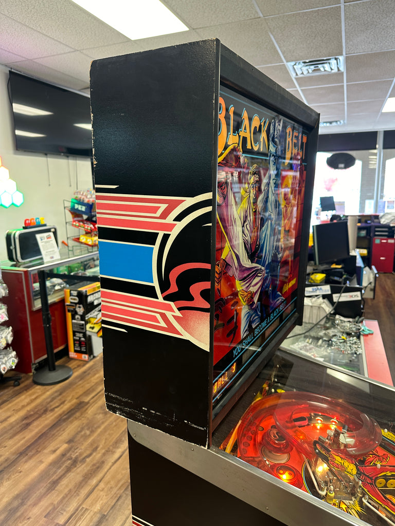 Black Belt features four flippers, including one inverted flipper located in the upper right portion of the playfield — a rarity in pinball design. This innovative layout allows for creative shot angles and exciting gameplay variety. The playfield art and theme immerse players in a martial arts adventure, combining fast-paced action with precise ball control.