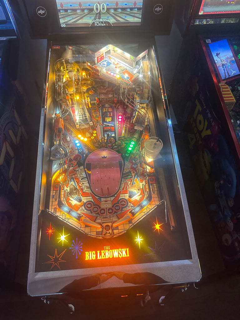 Pinball Arcade Salvation is honored to present you the Dutch Pinball The Big Lebowski Pinball Machine – a beautifully crafted, cinematic tribute to the cult-classic film. Featuring a Brunswick™ bowling alley with controlled pins, The Dude’s car bash toy, the iconic “rug,” 3 flippers, a multi-level playfield, and over 200 quotes and clips, this machine delivers an unforgettable, movie-accurate pinball experience. This example looks brand new and includes an upgraded starry apron.