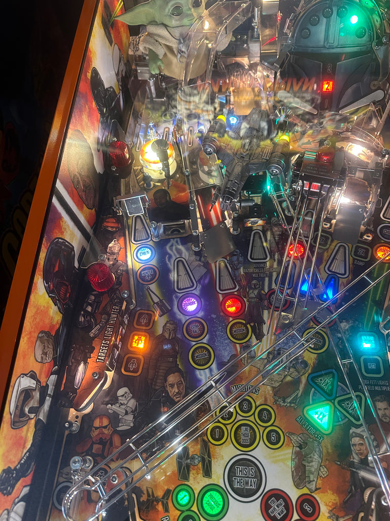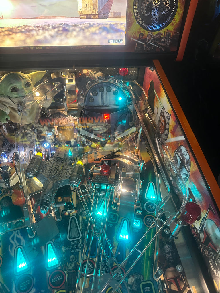 Pinball Arcade Salvation is honored to present you the Stern Pinball LOADED The Mandalorian Premium Pinball Machine. Featuring the official shooter rod mod, rotating upper mini playfield, custom Grogu sculpture, shaker motor, and premium upgrades, this action-packed pinball quest immerses you in the galaxy far, far away.