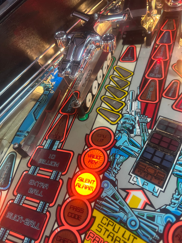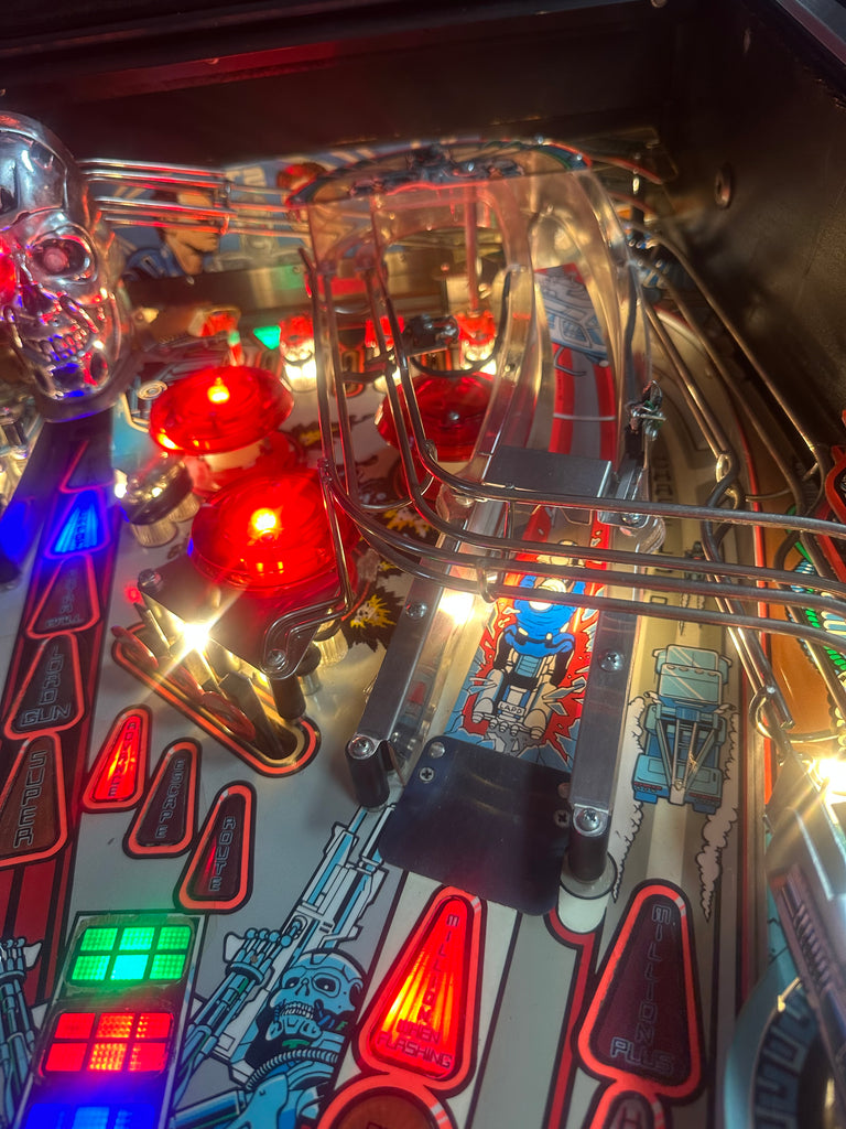 The machine features the iconic chrome-plated gun launcher, which not only sets the tone for play but allows players to feel like they are literally entering the war against Skynet. Multiball action, fast ramps, drop targets, chase sequences, and the revolutionary video mode bring depth, speed, and excitement. The dramatic soundtrack, authentic voice clips from Schwarzenegger, and themed artwork immerse players in the Terminator universe.